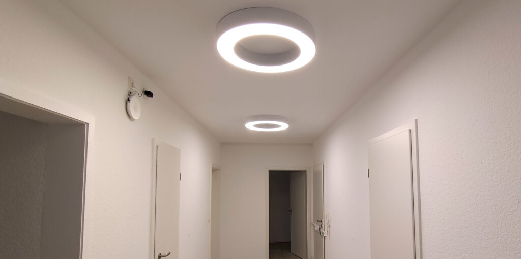 In allen Räumen der großen Wohnung (über 160 m²) sollten moderne Beleuchtungslösungen angebracht werden. Der Bauherr bat uns, auf eine einheitliche Lichtfarbe zu achten, in diesem Fall 4.000 Kelvin. In vielen Räumen sollte statt zuvor nur eine auch zwei oder mehr Lampen angebracht werden. Im großen, langgezogenen Gang wählten wir gemeinsam mit dem Kunden 2 Lampen mit je 3.700 Lumen aus. In einem großen Büroraum setzten wir tatsächlich nur eine Lampe des gleichen Typs mit einem Durchmesser von 80 cm mit 5.200 Lumen..