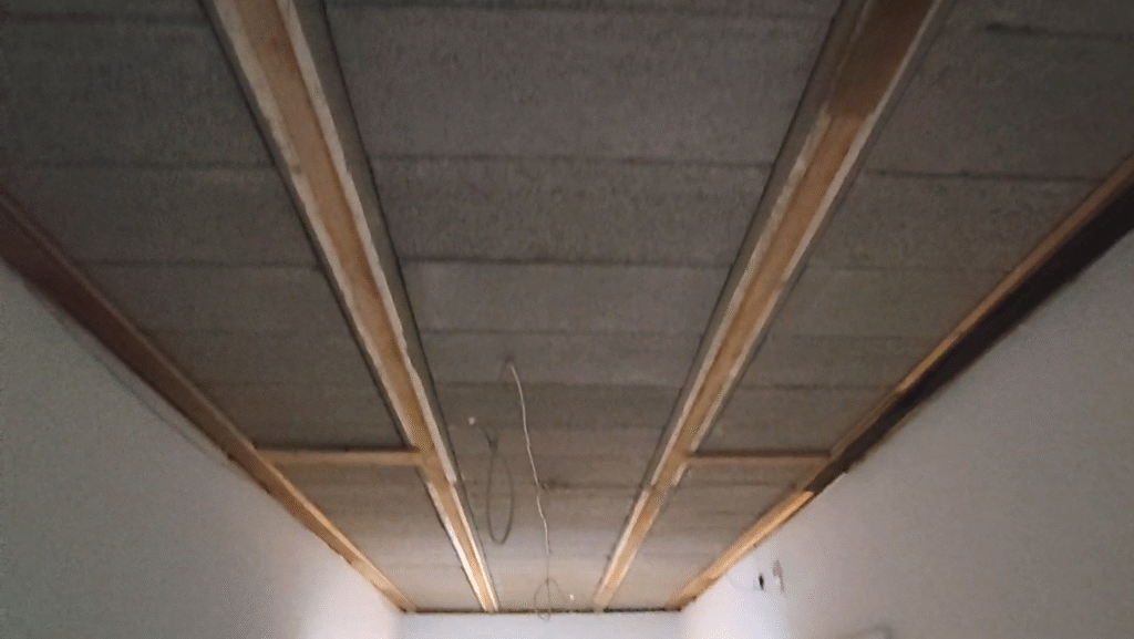 Da vorher eine dunkelbraune Holzdecke eingezogen war, bat uns der Kunde, diese zu entfernen. Hier sieht man, den einzigen Stromanschluss. Das Anbringen mehrerer Lampen ist natürlich besonders einfach, wenn auch die Decke saniert wird.